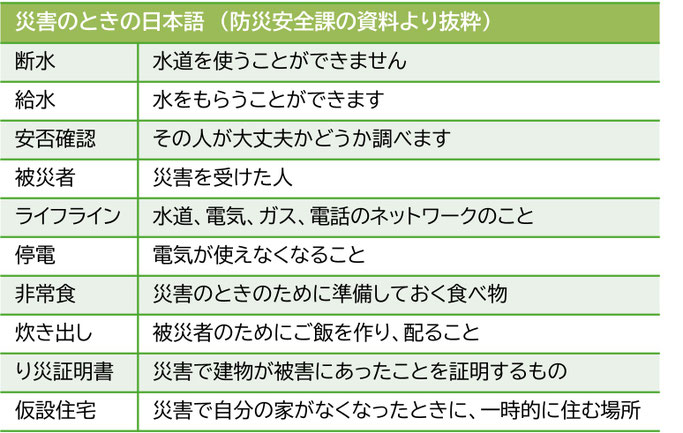 また、災害用語を右の表に示します。漢字が連なる言葉は、外国人には難しいです。能登半島地震でも、避難所に行けたのに言葉がわからず、食事も毛布も受け取れない外国人がいた例もあります。これらの言葉には、翻訳や「やさしい日本語」だけで伝えきるのは難しいものもあります。実際に物を指し示したり、誘導したりしながら、現場に即した形で言葉を伝えていく必要があります。