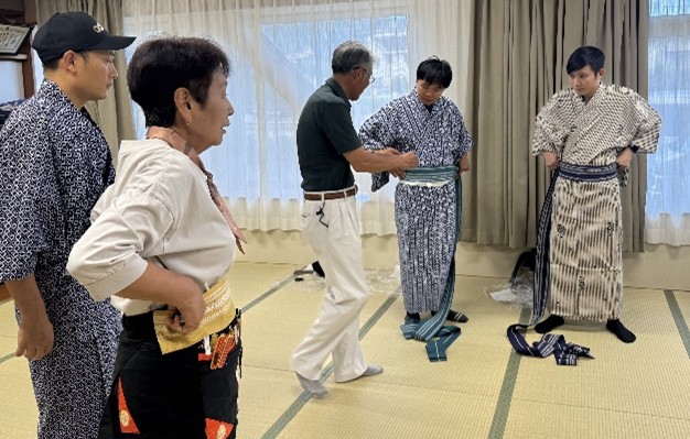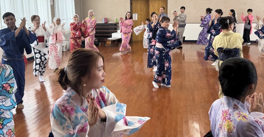 豊坂女性の会から「文化を共有したい」とのお誘いで、「浴衣を着て踊る会」に日本語サロンの生徒さん16名が参加しました。浴衣も踊りも大いに楽しみました。